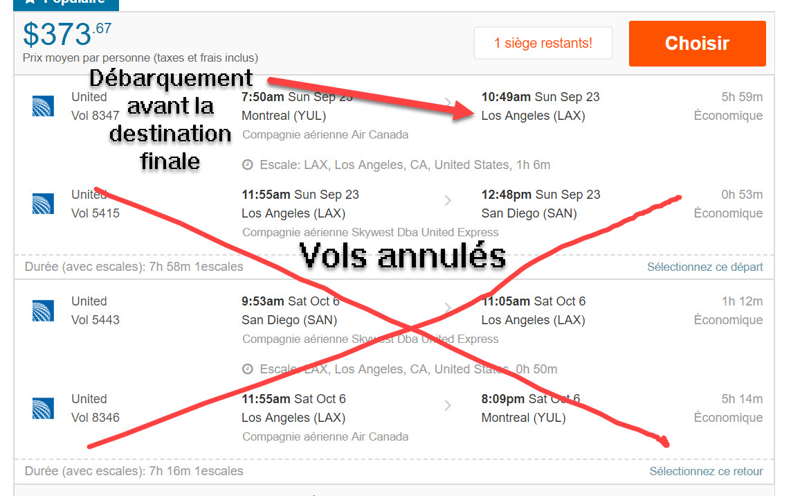 L'exemple donné dans cet article parle d'un vol aller-retour pour San Diego avec escale à Los Angeles et l'auteure nous dit que vous pouvez tout simplement débarquer lors de cette escale puis reprendre les vols du retour de San Diego. Une très grosse erreur de sa part car si vous faites cela, les vols de retour pour Montréal de San Diego seront tous annulés par la compagnie aérienne puisque vous n'aurez pas respecté l’itinéraire sur votre billet.