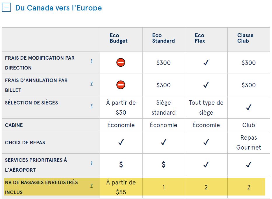 À partir du 2 octobre, Air Transat suit Air Canada avec de nouvelles options tarifaires incluant une nouvelle classe de billet économique pour l'Europe sans bagage en soute inclus et sans possibilités de modification pour les départs après le 1er avril 2019 prochain. Dorénavant seulement un bagage à main et 1 item personnel maximum 10 Kg seront inclus sur la classe Éco Budget contrairement à la classe Éco Standard où 1 bagage à main max 10 kg et 1 bagage en soute sont inclus dans le prix d'un billet.